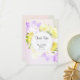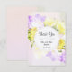 Beautiful and elegant watercolor freesia flowers in yellow, lavender and white colours forming a lovely floral wedding arrangement with a round white badge.