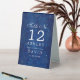 Watercolor Galaxy Cosmic Stars Starry Table Number Table Tent Sign. This design features twinkling star lights in space against a nebula starry sky of a celestial navy blue universe. Personalise this custom design with your own text and event details.