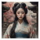 A watercolor Geisha exquisitely dressed in traditional kimono, cherry blossoms.