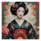 A watercolor Geisha exquisitely dressed in traditional kimono, cherry blossoms.