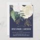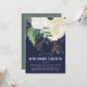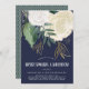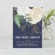 A pretty and modern bridal shower invitation in sage green, navy blue and faux gold glitter, featuring watercolor roses and leaves and brush lettered style font. The reverse has a linked diamond pattern in white on a sage green background.