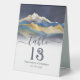 Modern Vintage Elegant Wedding Table Numbers Cards / Table Tent Sign Template - Blue Green and Faux Gold Foil Watercolor Mountains Landscapes Scenery.