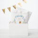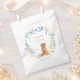 This personalized wedding favor bag features a hand-painted watercolor crest adorned with delicate florals, a soft blue ribbon bow, and a charming golden retriever at the center. The design blends romantic botanical details with a warm, illustrative dog portrait, creating a sweet and memorable keepsake for guests.