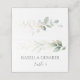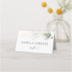 Elegant folded place card with illustration of green and gold foliage in watercolor style.