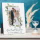Modern Minimalist Elegance Calligraphy Ink Pen Handwritten Script Our First Christmas Newlywed Wedding Photo Plaque includes Elegant Watercolor Greenery, Eucalyptus Leaves & Holly Berries. Green Script.