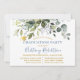 Modern Elegant Watercolor Greenery Graduation Party Invitation includes eucalyptus leaves, green botanical foliage, dusty blue leaves and other beautiful botanical greenery. Trendy Calligraphy Script. Gold Grad Cap. Dusty Blue Back.