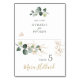 Elegant flat place card featuring an illustration of eucalyptus and gold leaves in watercolor style. The horizontal line in the middle to show where to bend (you can remove it)