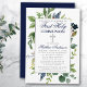 Elegant Watercolor Botanical Greenery First Holy Communion Invitation includes blue accents. Silver Frame. Silver Cross. Navy Blue Back.