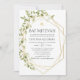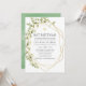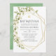 Trendy sage green and white watercolor leaves bat mitzvah invitation with gold geometric frame.