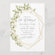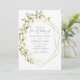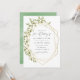 Trendy sage green and white watercolor leaves wedding invitation with gold geometric frame.