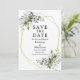 Modern Elegant Watercolor Botanical Greenery Save The Date Card includes eucalyptus leaves, green botanical foliage, dusty blue leaves and other beautiful botanical greenery. Gold Geometric Frame.