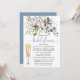 Modern Elegant Watercolor Botanical Greenery Bridal Shower Invitation Card includes eucalyptus leaves, green botanical foliage, dusty blue leaves and other beautiful botanical greenery. Dusty Blue Back. Champagne Glass with Dusty Blue Bow. Trendy Calligraphy Script.