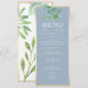 Simple, elegant, botanical dusty blue wedding menu, with watercolor eucalyptus greenery and modern calligraphy script.