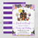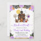 Cute Watercolor Trick or Treat Halloween design with haunted house, bear, fox, dog and racoon animals in costumes, a ghost and purple and black flowers