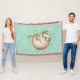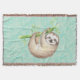 An adorable watercolor graphic features smiling sloth hangs from a branch on aqua and gold dot background