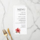 An elegant coral red and white hibiscus wedding menu featuring modern watercolor designs with tropical greenery and exotic florals for your Hawaii celebration.