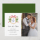 Elegant "Save the Date" wedding Photo invitation card for Holiday winter wedding featuring hand drawn watercolor crest with winter greenery and bow with the couples initials.