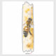 This vibrant artwork features a detailed honey bee rendered in a lively watercolor style. The bee is depicted in mid-flight, its delicate wings outstretched and its fuzzy body highlighted with shades of yellow, orange, and black. The artist captures the bee’s intricate details, from its striped abdomen to its fine, translucent wings.