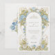 This graceful wedding invitation features a hand-painted Art Nouveau design in soft watercolor tones, perfect for couples seeking a refined and artistic touch. The front displays a romantic floral arch filled with blue, cream, blush, and soft sage green blooms, intertwined with swirling leaves and golden scrolls that create a vintage botanical frame around the wedding text.