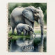 Double sided notebook. A sweet ai watercolor style illustration of a mama elephant and her baby drinking from a pond with a cute reflection. The back has one elephant in the savanna.