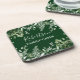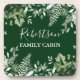 Family Name Cabin Watercolor Botanical Greenery Coaster includes ivy, fern and sage leaves. Forest Green background.