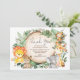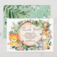Whimsical thank you card featuring illustration of rustic watercolor greens, foliages and adorable jungle animals: lion, elephant, giraffe, monkey and hippo