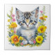 Watercolor Kitten in Yellow and Pink Flowers Tile