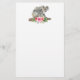 Stationery paper with an adorable watercolor design. Koala bear mum and baby. Baby is riding on momma's back. Standing on a tree branch. A hibiscus flower bouquet below.
