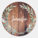 Watercolor botanical leaves, monogram name, on rustic wood background, envelope seals stickers.