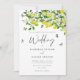 This is a watercolor lemon and citrus themed wedding invitation. The design shows a branch of a summery lemon tree, its white flowers, green leaves and fluttering butterflies.