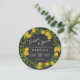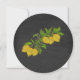 Round wedding invitation featuring a rustic Italian farmhouse watercolor lemon foliage wreath on a chalkboard background.