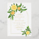 Invite guests to your wedding with this customisable gold foil wedding invitation. It features watercolor illustrations of lemons, kumquats and greenery with an arch accent. Personalise by adding your own wedding details. This lemon wedding invitation is perfect for summer weddings.