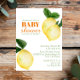 This custom baby shower invitation features a citrus theme. Two watercolor lemons are placed in the top right, with another lemon in the bottom left. The "Baby Shower" title is printed in a vibrant orange colour, with the rest of the text in a lime green.