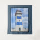 Nautical themed design with watercolor lighthouse decoration in dark blue frame. It is possible to change the background colour and to add different one to the design with your choice.