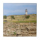 Watercolor lighthouse with trees and flowers in blossom in an archaeological sight in Paphos, Cyprus