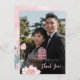 This modern Chinese wedding thank you card features a custom photo, a dusty pink double happiness symbol, and a watercolor painted lotus flower on a pink watercolor background and an elegant handwritten script.