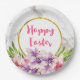 Peronalized paper plates for Easter with a springtime design - a faux marble texture in white makes up the background. Layered over top is a frame with a faux gold foil border. Large pink and purple watercolor magnolia flowers with green leafy accents decorate the design.