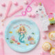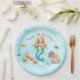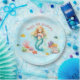 This watercolor mermaid clipart features a cute under-the-sea mermaid with flowing blonde hair, a turquoise tail, a purple seashell top, and surrounding coral, shells, and bubbles. Perfect for kids’ birthday invitations, party décor, and underwater-themed accessories.