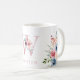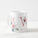 A floral personalised coffee mug with a name and rose pink monogram letter "W", and with a decorative watercolor foliage and flowers.