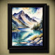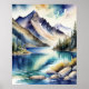 Watercolor Mountain Lake Scene. The aspect ratio is 4:5. It was designed to be printed as 4"×5", 8"x10", or 16"×20", 24"x30"