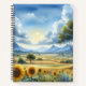 This notebook has two watercolor images in one notebook. Front side has a nature scene with sunflowers. The back has a reindeer on a rock.