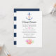Trendy navy blue and white nautical virtual long distance bridal shower invitation featuring a watercolor floral anchor, flowers and navy stripes on the reverse.