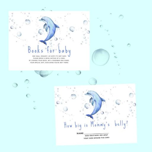 A little one on the way with this under the sea themed baby shower invitation, featuring baby dolphin in soft blue watercolors. Watercolor water bubbles.