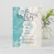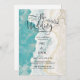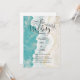The invitation's background is a captivating watercolor masterpiece, artfully depicting ocean waves gently meeting a sandy shore. Swirls of calming blues, soft aquas, and frothy whites blend seamlessly with muted, sandy tones, creating a dynamic yet peaceful representation of the ebb and flow of the tide. Adding authentic seaside charm are delicate illustrations of starfish – one subtly placed at the upper right, and another, more prominently featured, in the lower left corner, contributing a truly unique aesthetic.