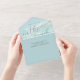 This elegant wedding invitation features a calming blue and tan beach watercolor background on the inside, capturing a soft, slightly abstract view of the shore as it meets gentle ocean waves for a relaxed coastal feel. The outside of the card is a solid teal blue, providing a striking and modern contrast.