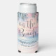 Celebrate your seaside wedding with this elegant can cooler featuring a soft pastel sunset watercolor design over the ocean. Warm sunset hues blend gently across the sky as waves meet the shore, creating a romantic, airy coastal feel, with subtle palm leaf accents adding a tropical touch.