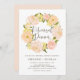 Invite guests to your event with this customisable rehearsal dinner invitation. It features a light orange peony wreath. Personalise this botanical invitation by adding your details. This floral wreath rehearsal dinner invitation is perfect for spring and garden events.