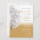 Modern watercolor wedding invitation featuring an elegant floral, white orchid watercolor illustration in warm shades of white, green, yellow, and pale grey. The background of the card is designed with an ombre effect, blending from white to a beautiful golden hue, along with gold glitter. This invitation template includes wording for a couple hosting their wedding but the wording can be edited to match your event.