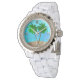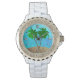 Watch in a Beach scene of tropical palms, sand and sky made from a digital collage of watercolor and patterned images