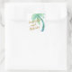Gold coloured names and date and a soft green watercolor palm tree painting favour label sticker - whimsical, formal and fun at the same time. Perfect for tropical beach weddings and destination weddings.